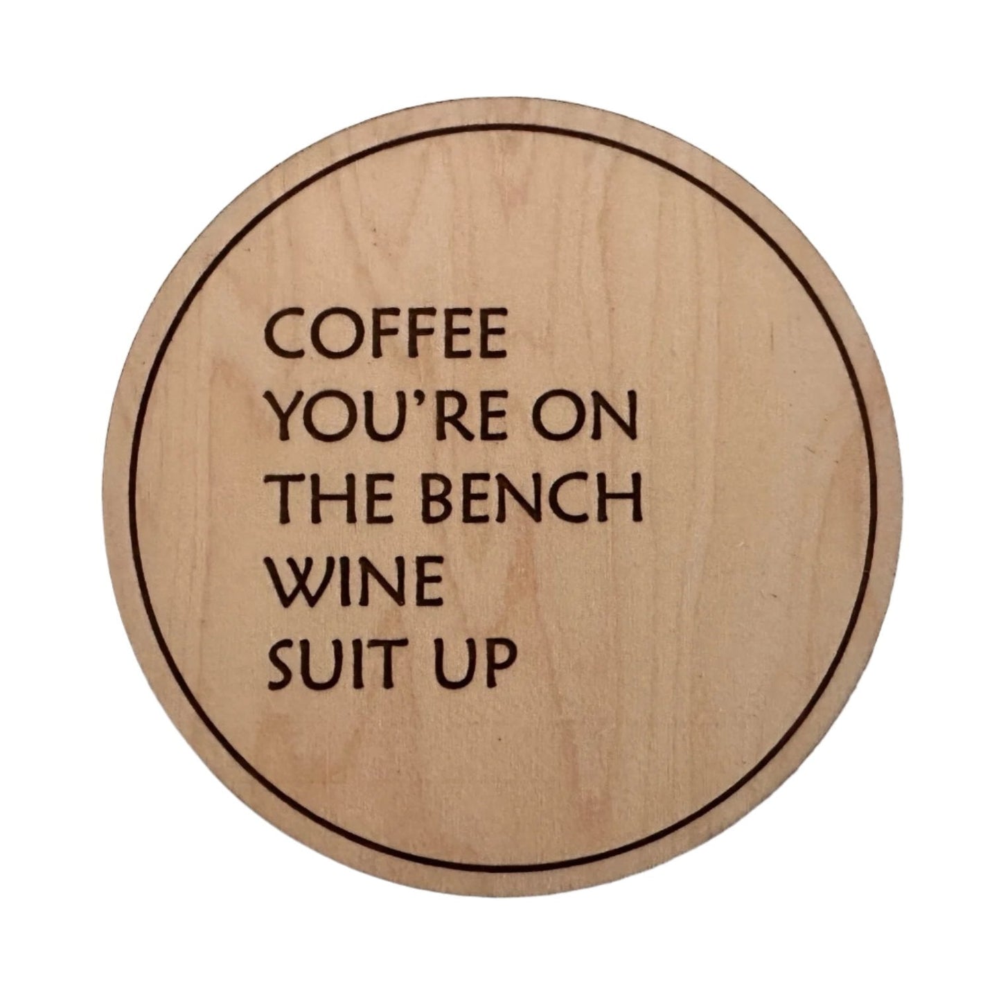 Set of 4 wooden Maple Coasters to enliven any gathering. These coasters boast a modern 4" round design with a corked bottom, providing both style and function. Conversation is sure to ignite with the addition of these witty and fun coasters.