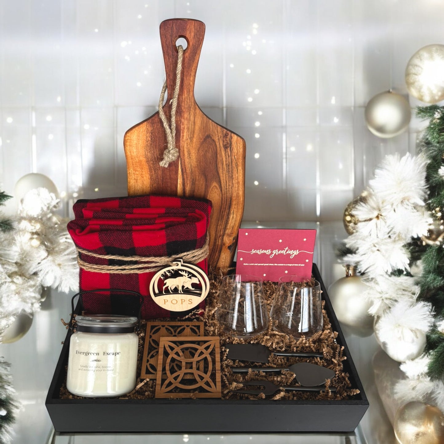 The Rustic Luxe Box -Evergreen Escape - All is calm, all is cozy - especially when you’re escaping the chaos. Evergreen Escape is your holiday reset in a box, perfect for gifting, unwinding, and maybe sneaking a little distance from your in-laws. With wine, candlelight, cozy layers, and a bit of personalization, this set delivers instant peace, no explanations required. Just add wine and cheese and your al set!