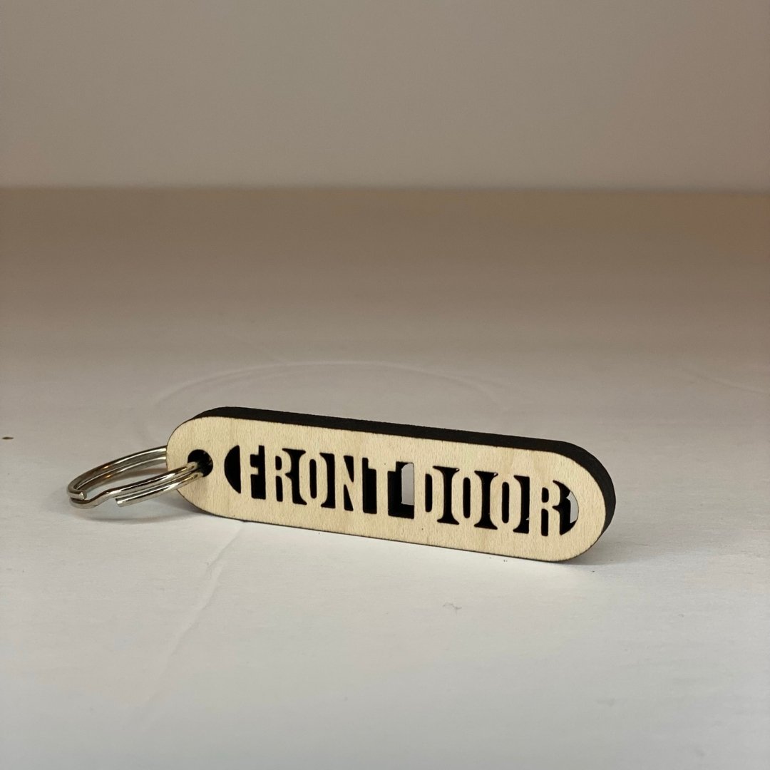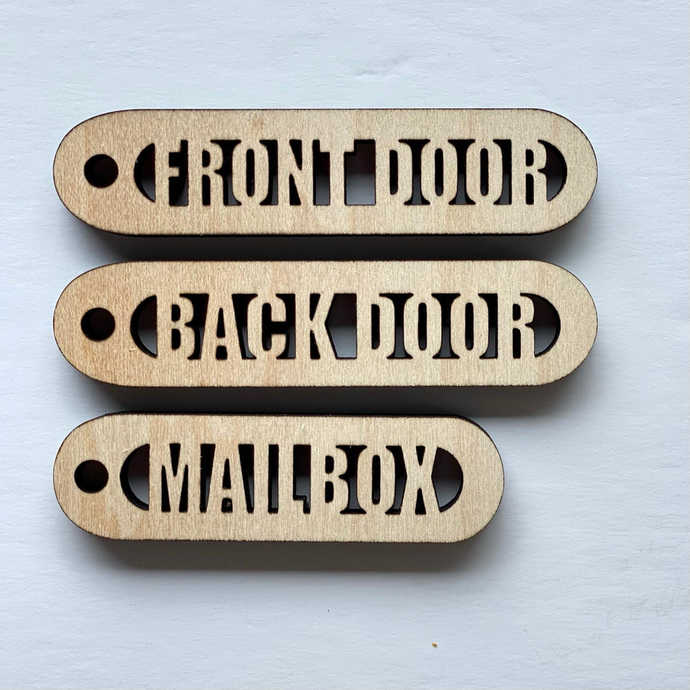 Custom Laser cut wooden keychains with round framed letters, to tell you exactly what key is for what door. No more trying out every key for every door you have to walk though. These are a great addition for any friend, family member or new home owner. These keychains are a unique add on to your New Home welcome basket or crate for friends or loved ones.